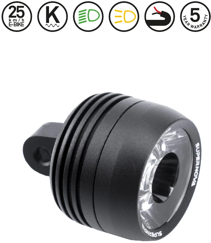 Der Mini 2 Scheinwerfer ist ein weiteres Beispiel für die stetige Weiterentwicklung bei Supernova – in diesem Fall die neueste Elektronik in einem rekordverdächtig kleinem Gehäuse welches durch die neue Low Direct Mount Halterung perfekt und absolut elegant im Cockpit integrierbar ist. Nun können Spannungen von 5 bis 21 Volt verarbeitet werden, was den Scheinwerfer zu den meisten Antrieben kompatibel macht. Ein besonderes Highlight ist die Softstartfunktion womit der Scheinwerfer auch mit jenen Antrieben betrieben weren kann, die empfindlich auf hohe Startströme reagieren. Gleichzeitig wird dadurch die Lebensdauer und Helligkeitsbeständigkeit des LED Leuchtmittels verbessert. Daher gibt Supernova auf den Mini 2 ganze 5 Jahre Garantie. Über einen Schalter verfügt die Frontleuchte nicht. Stattdessen wird sie bequem über die Steuerung des E-Bikes bedient.
